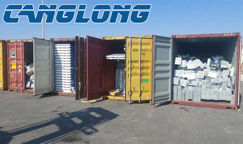 The Somali client is building a tuna processing workshop, and Canglong Group has designed a steel structure workshop plan for him. The columns and beams are made of H-shaped steel, the purlins are made of C/Z shaped steel, and the wall and roof panels are made of EPS sandwich panels. Recently, these steel structure kits have all arrived at the customer's construction site.